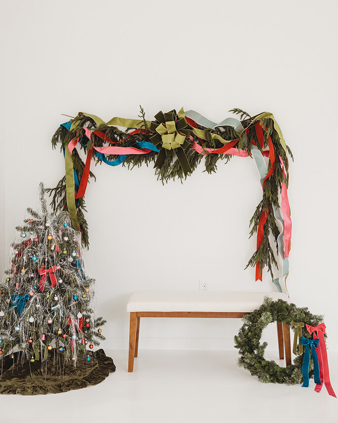 Set the scene for stunning holiday shoots with our curated collection of festive decor and props. This setup is bold and colorful with a 4 ft tinsel tree and bright ribbons on a garland arch. This colorful setup will remain in the studio for 5 weeks Through (Oct 12th). We will provide three full holiday sets. Stay tuned we will update the website to show the others we will be offering!